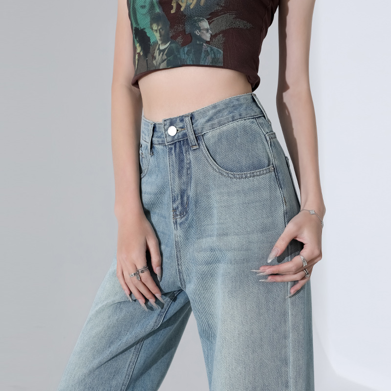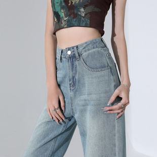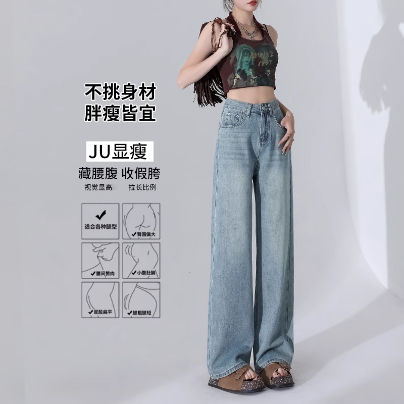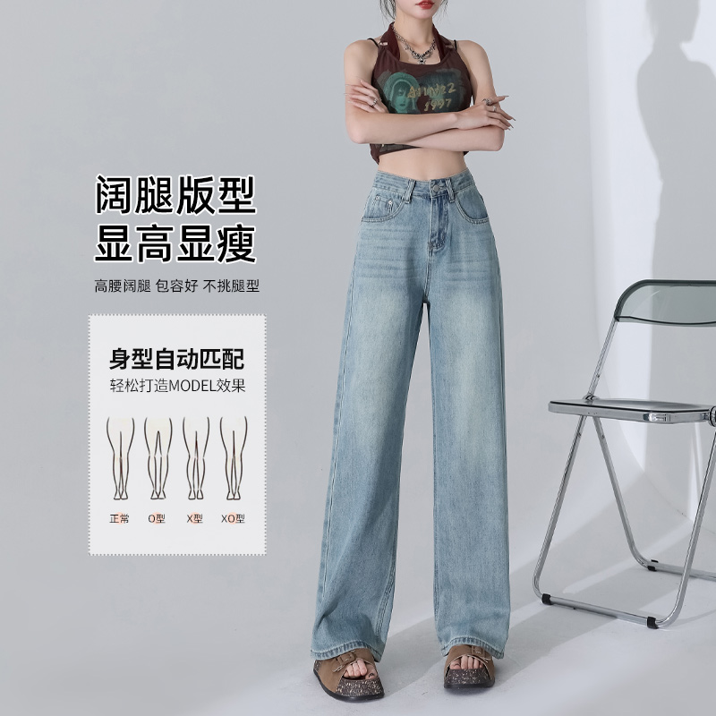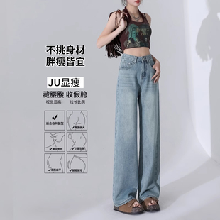 显瘦加长拖地女士直筒裤 阔腿牛仔裤 女2024春秋质感蓝高腰宽松窄版