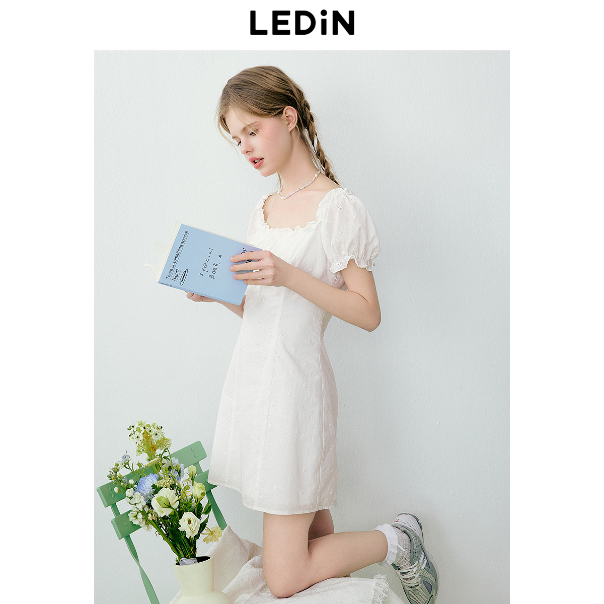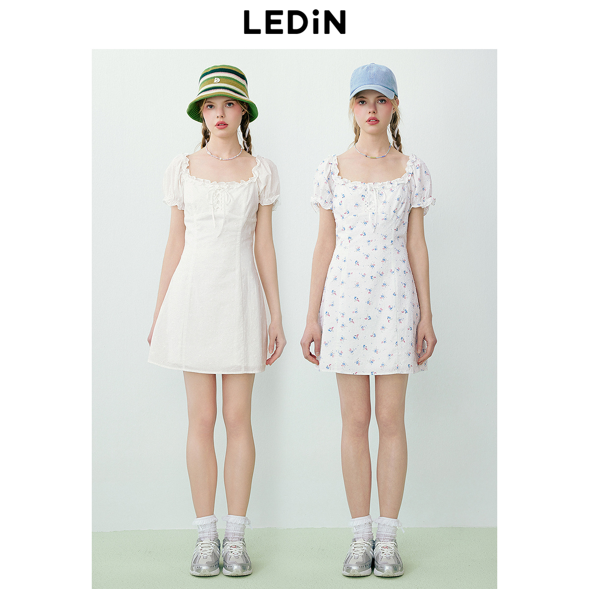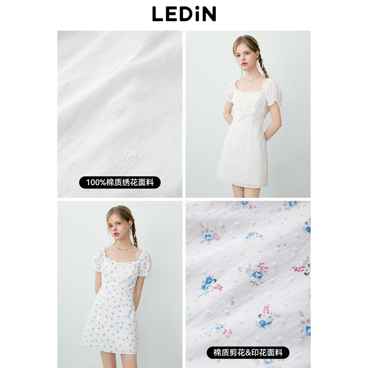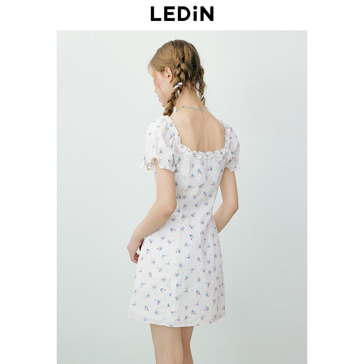 乐町纯欲风连衣裙夏季 花边方领显瘦A字裙小个子连衣短裙 新款