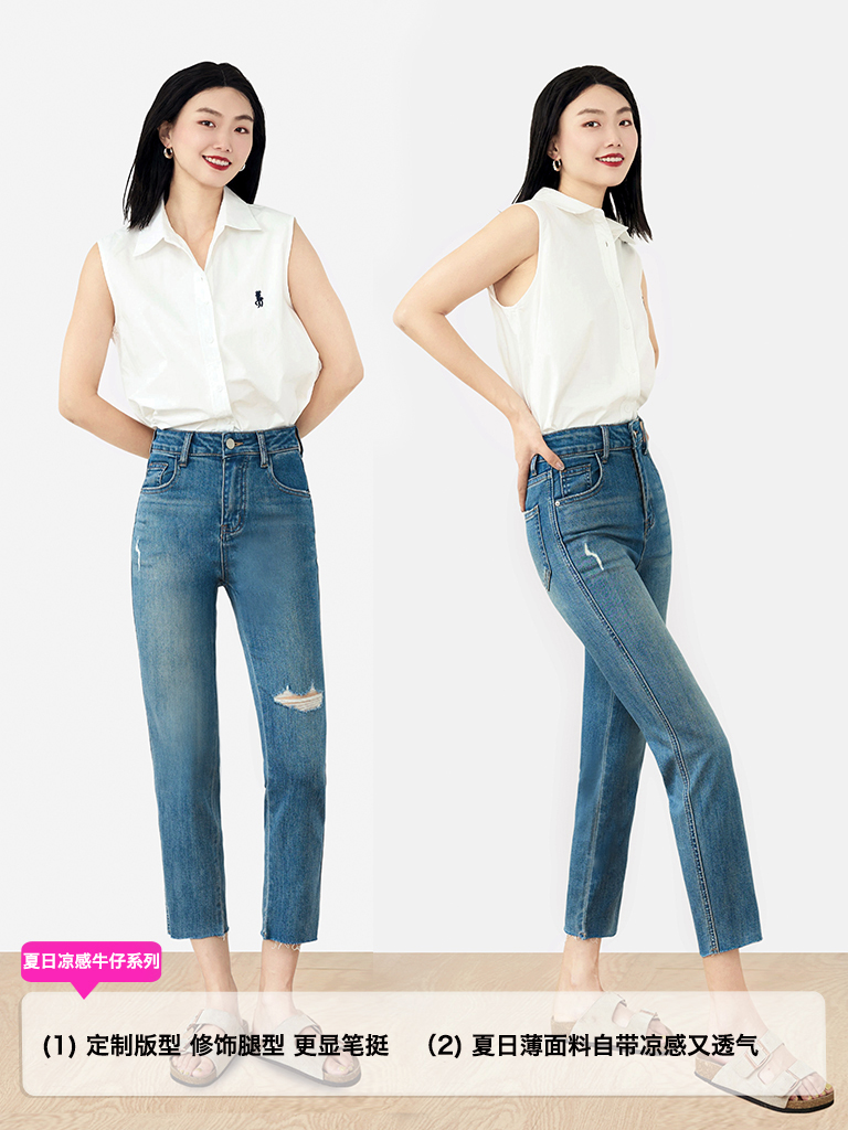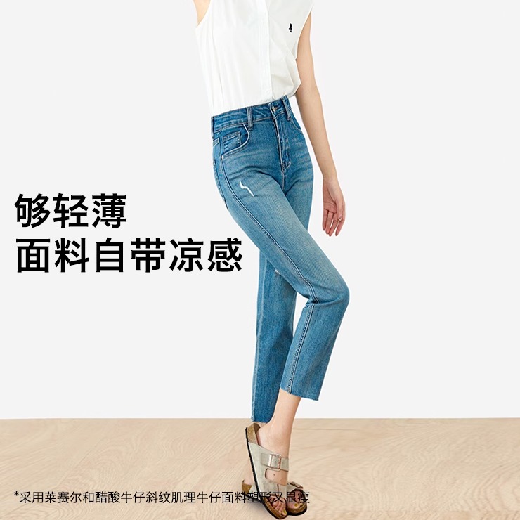 SJOG柔软亲肤显瘦膝盖破洞高腰直筒牛仔裤 女烟管小个子九分法棍裤