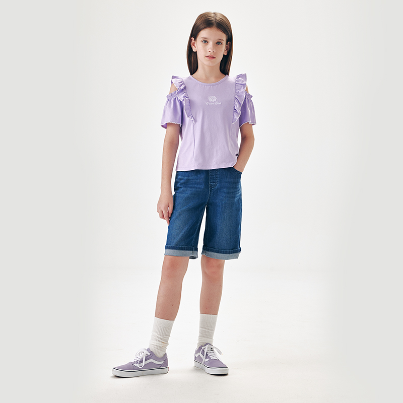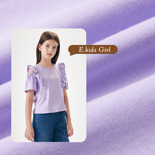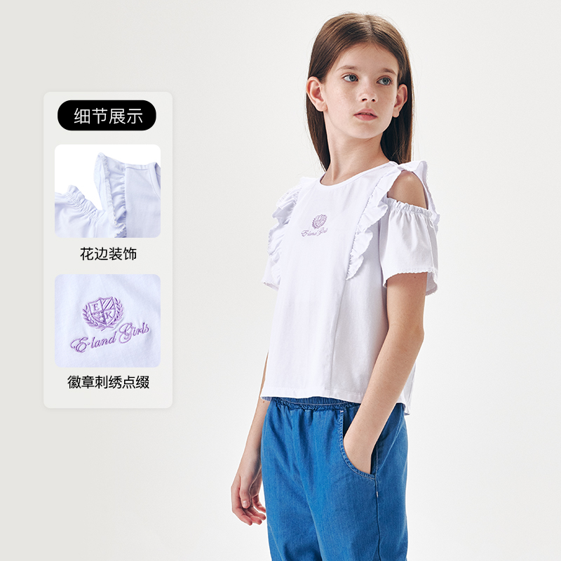 甜美花边露肩圆领短袖 女童T恤夏季 刺绣上衣 kids衣恋童装 eland