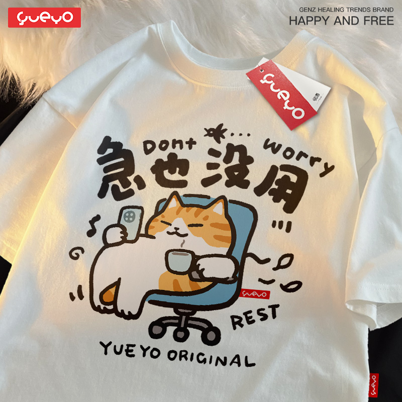 T恤男夏季 纯棉宽松搞笑短袖 休闲原创橘猫躺刷手机 急也没用 悦游