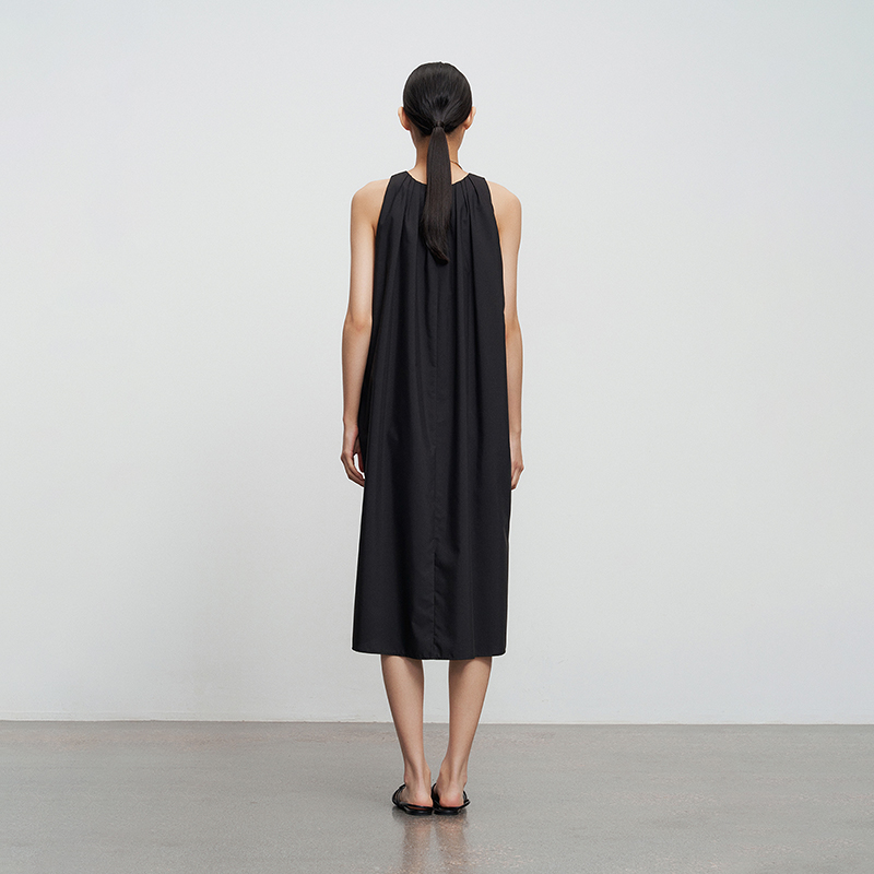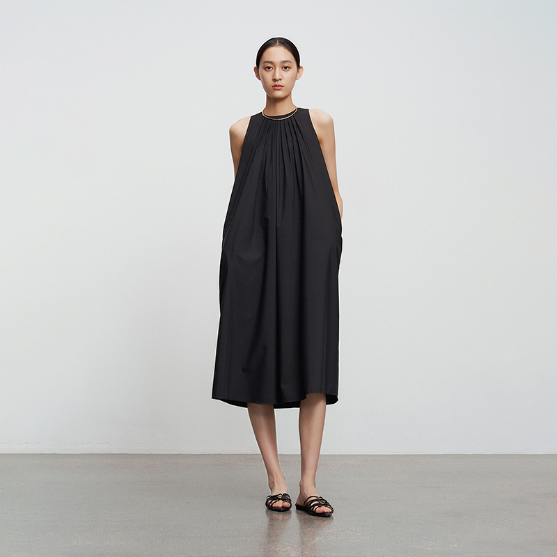 百搭圆领打褶无袖 黑色简约通勤经典 连衣裙 BLUE轻奢优雅女装