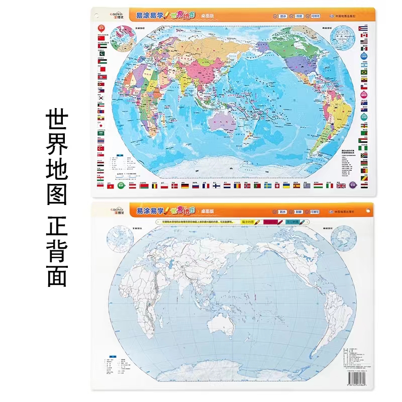 地理启蒙 世界地图 易涂易学 2张 8开 填色涂鸦 防水环保 少儿知识地图 套装 可反复擦写 附送水笔 社 中国地图出版 桌面版 中国