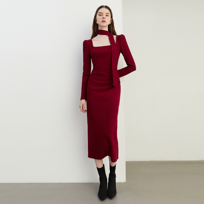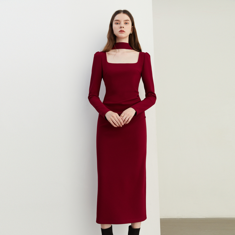 DPLAY年秋季 风红色可拆卸飘带订婚连衣裙长裙女 气质法式