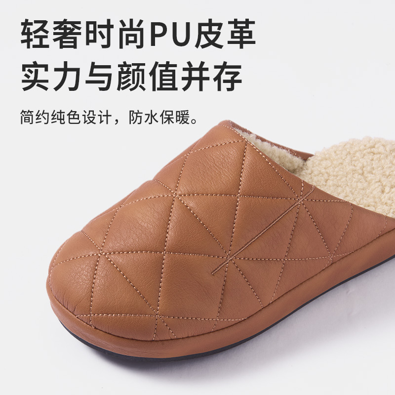 男 室内加绒保暖居家防滑牛筋底PU皮拖鞋 高级感防水棉拖鞋 女秋冬季