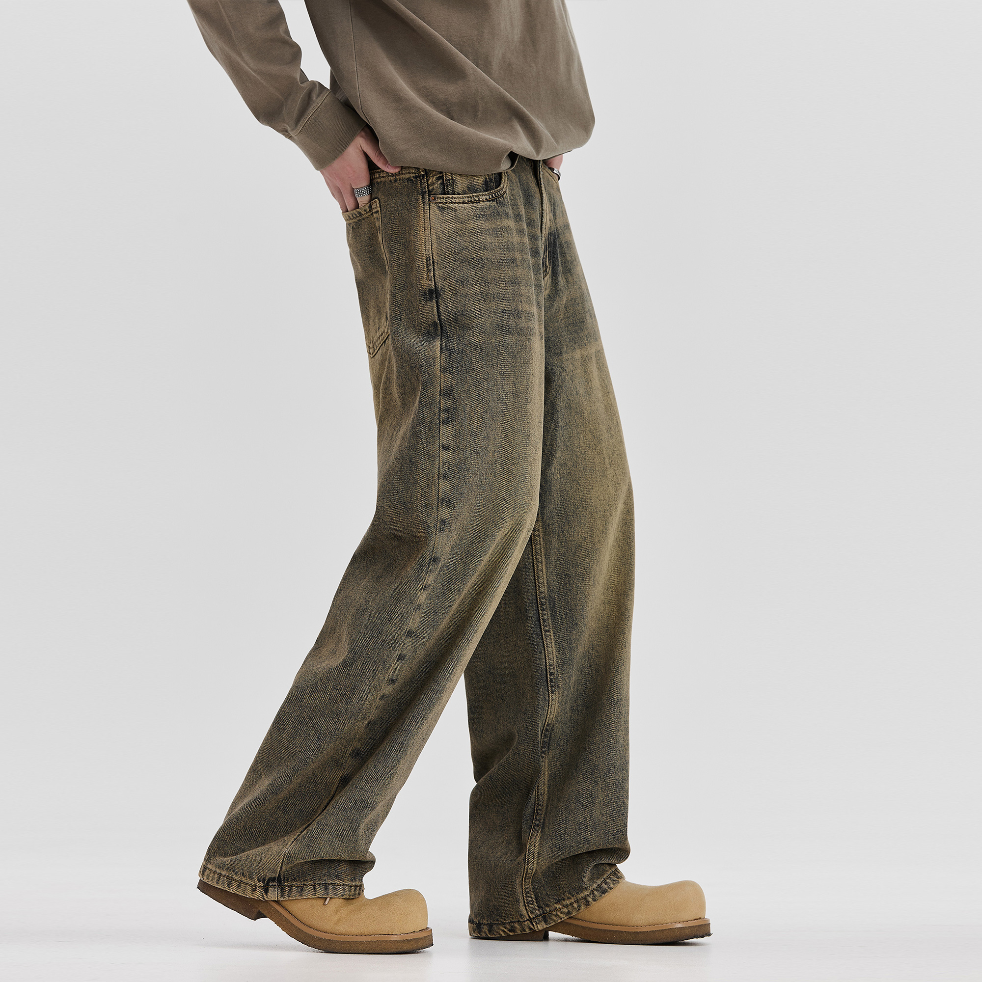 潮牌高街水洗做旧宽松直筒长裤 ALLIN 男夏季 复古阔腿牛仔裤 子 美式
