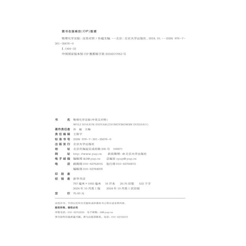 2024新书 北京大学出版 物理化学实验 孙越 社9787301356760 中英文对照 正版