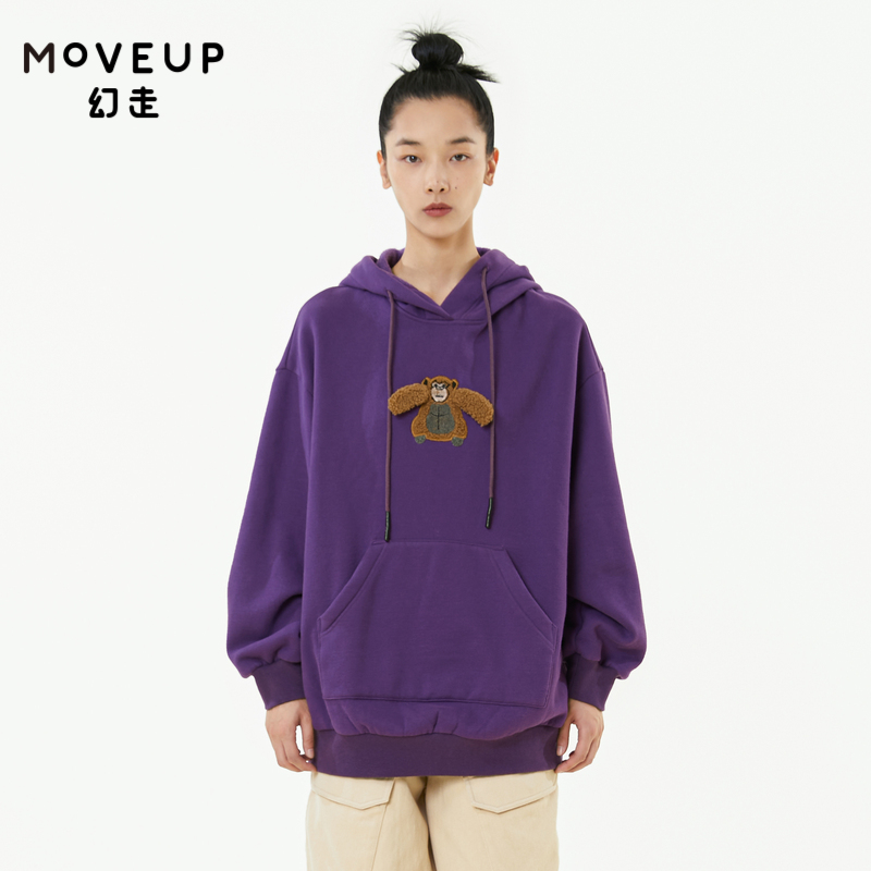 MOVEUP幻走2021秋冬季 套头卫衣加厚女 黑色连帽动物绣花加绒中长款