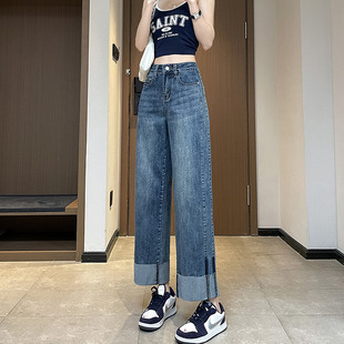 翻边直筒裤 遮胯宽松显瘦垂感时尚 女高腰2025年春秋新款 牛仔阔腿裤