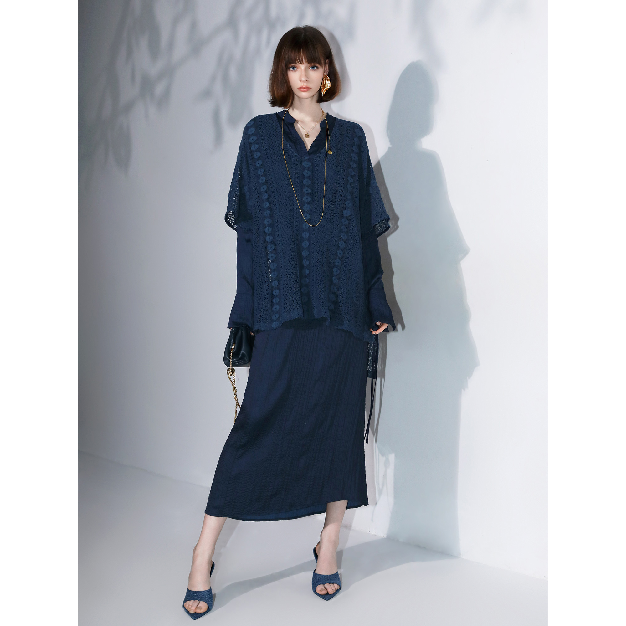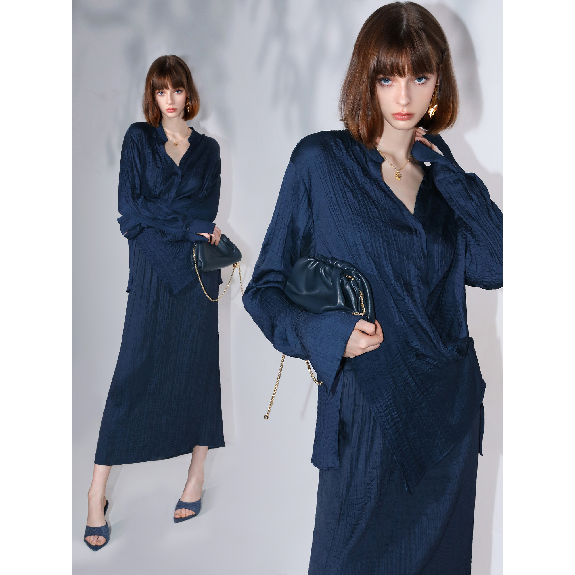 COCOBELLA丝光缎面压褶半身裙秋温柔风垂顺遮胯筒裙HS7026