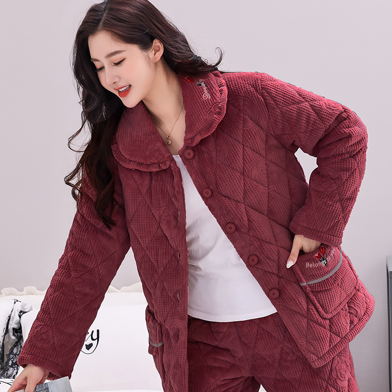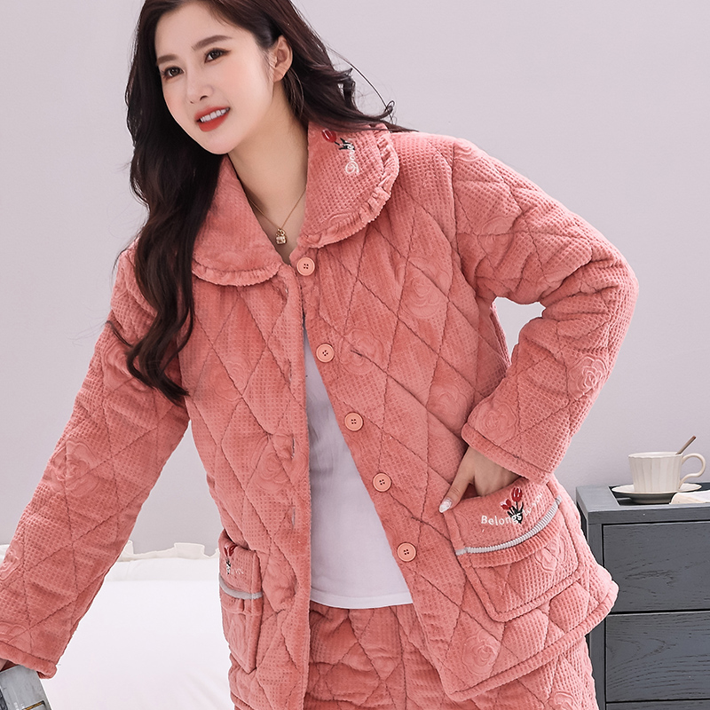 睡衣女士秋冬季 中青年 珊瑚绒加厚加绒三层夹棉袄可外穿家居服套装
