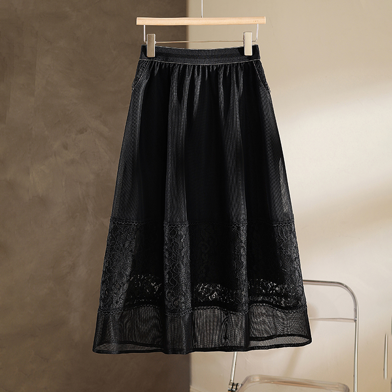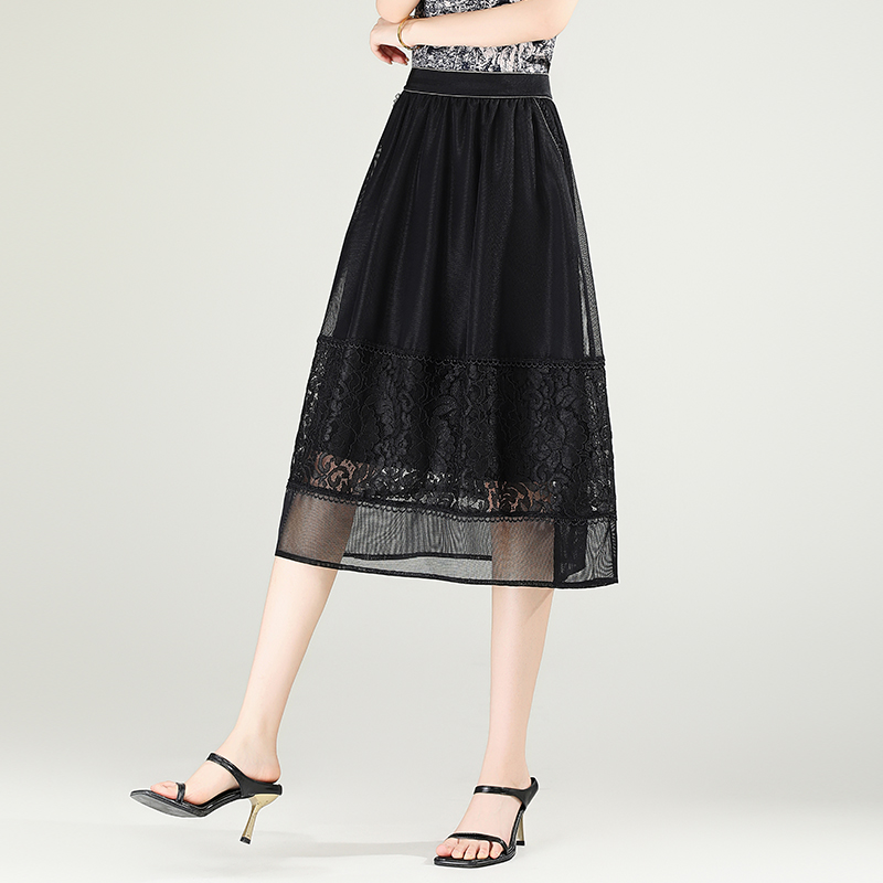 2025新款 蕾丝网纱拼接半身裙女中长花苞裙高腰显瘦a字灯笼裙 夏季