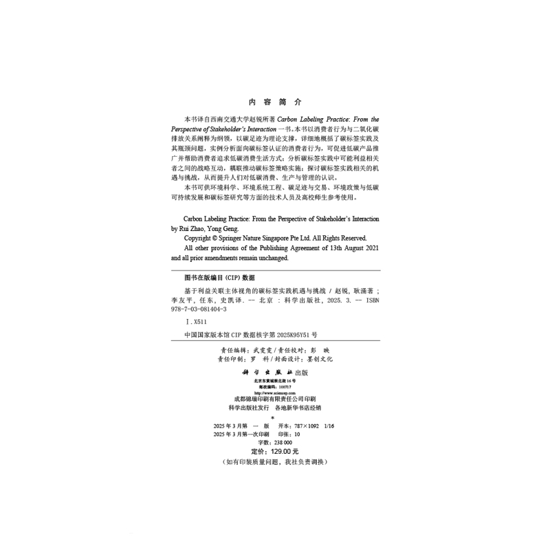 社新华书店正版 基于利益关联主体视角 史凯环境科学科学出版 任东 碳标签实践机遇与挑战李友平