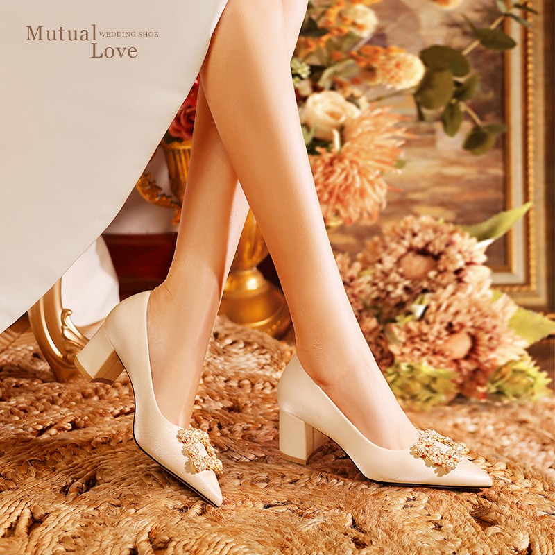 香槟色粗跟闪钻主婚纱缎面新娘鞋 2025新款 舒适低跟不累脚 女款 婚鞋