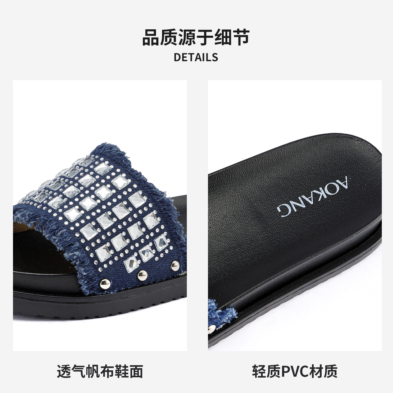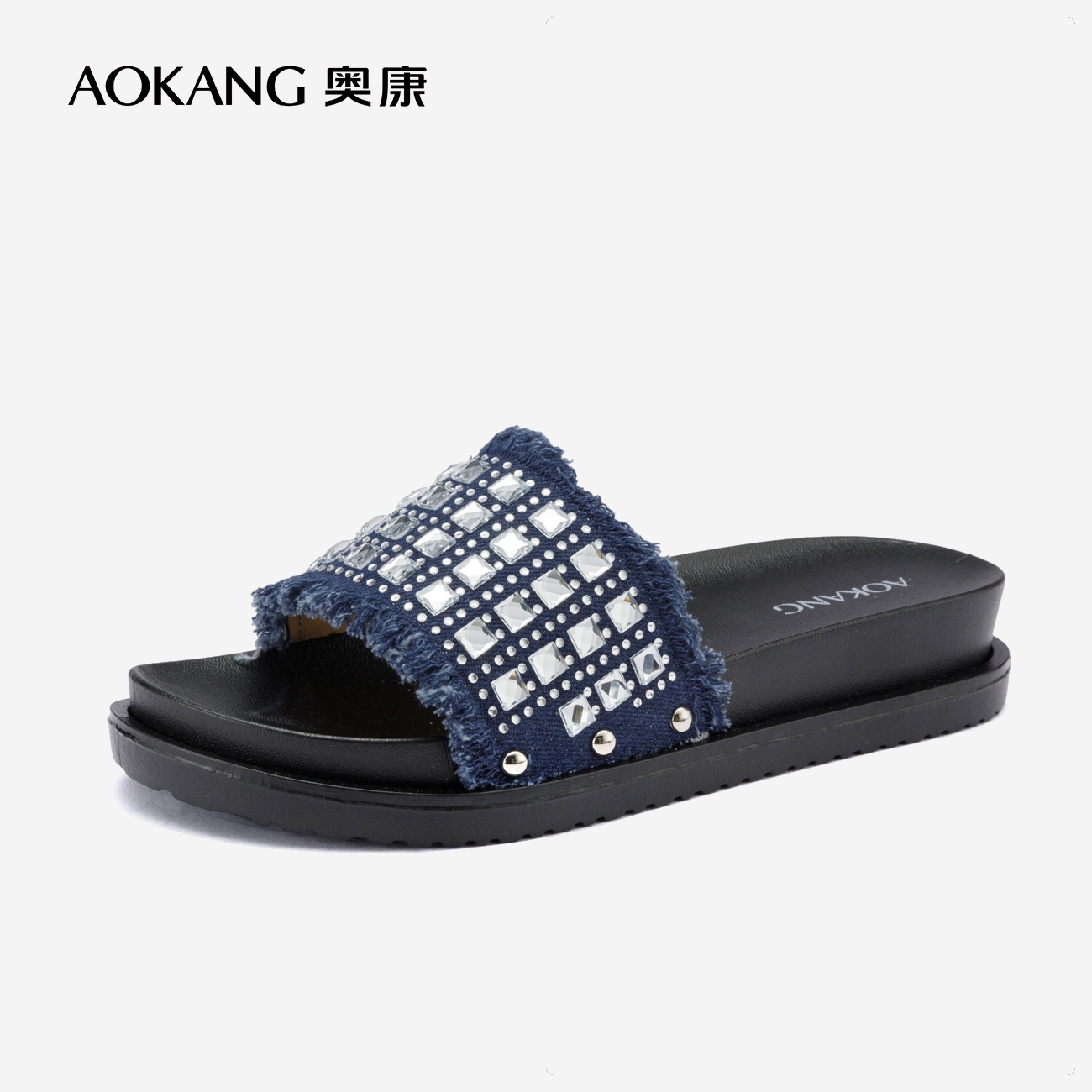 水钻牛仔流苏厚底一字拖可外穿防滑仙女拖鞋 奥康女鞋 时尚 新款 夏季