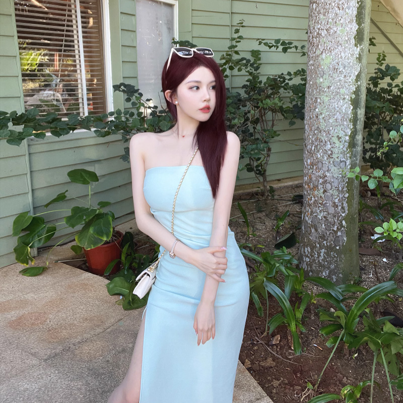 显身材开叉裙子甜辣纯欲收腰修身 性感抹胸连衣裙礼服中长裙女夏季