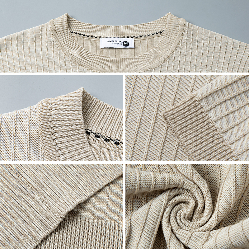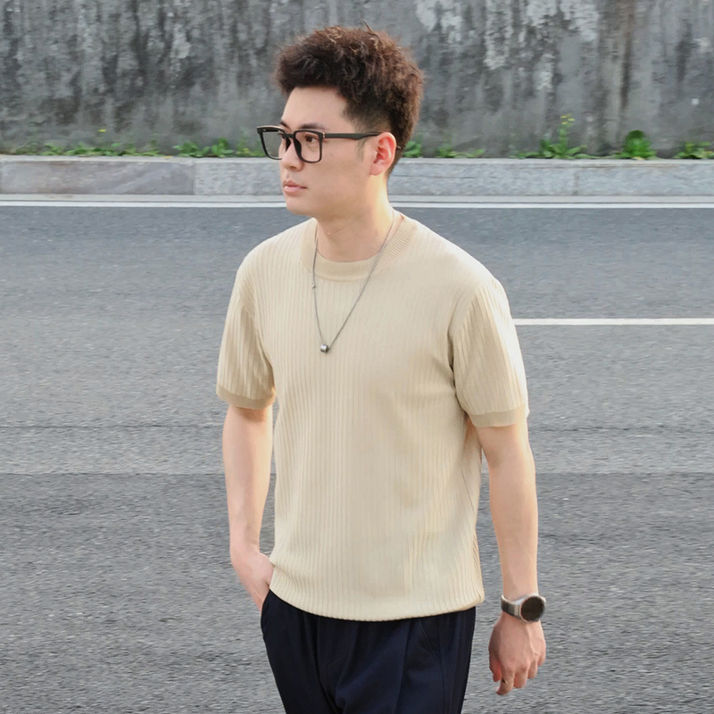 男 纯色圆领竖条纹圆领套头打底衫 复古肌理感冰丝针织短袖 T恤男款
