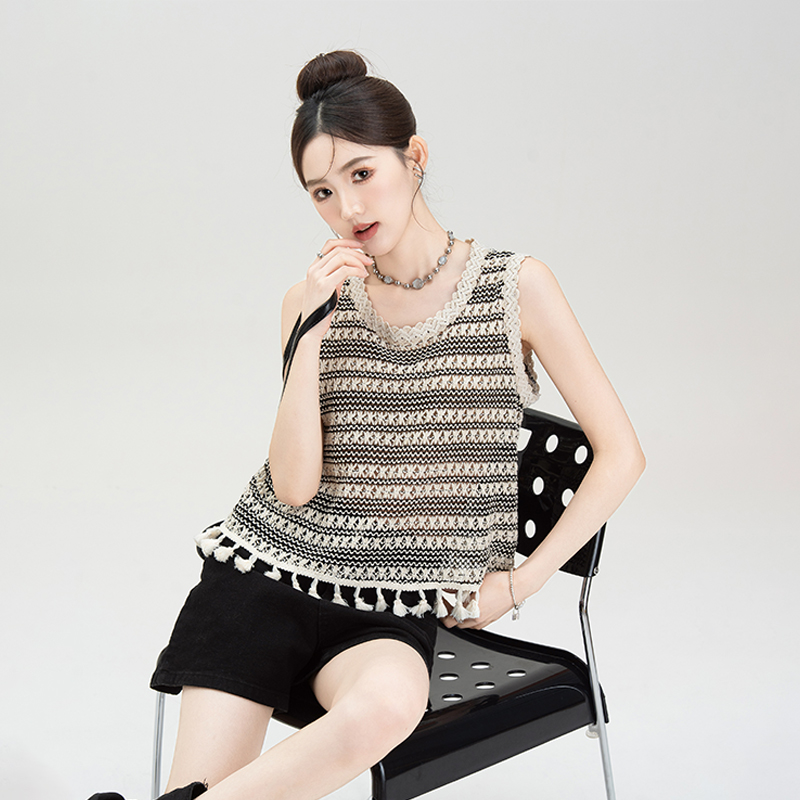 流苏上衣 钩花镂空无袖 黑色波西米亚风针织条纹吊带背心女夏季 新款