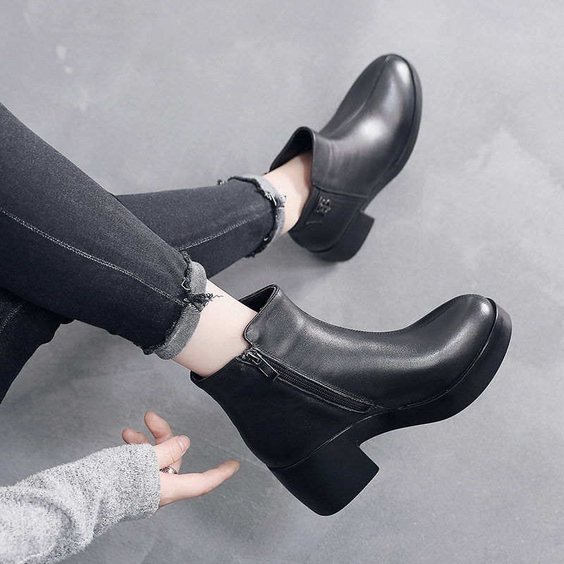 棉靴女 小码 新款 真皮中跟松糕短靴2025秋冬女圆头粗跟厚底加绒女鞋