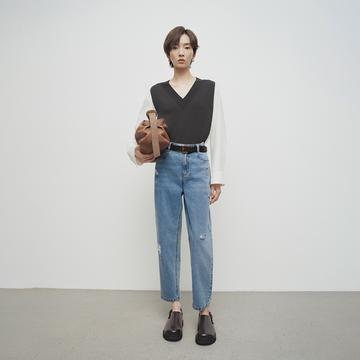 宽松长裤 女25春秋新款 BDS1KD0474 不规则破洞牛仔裤 播商场同款