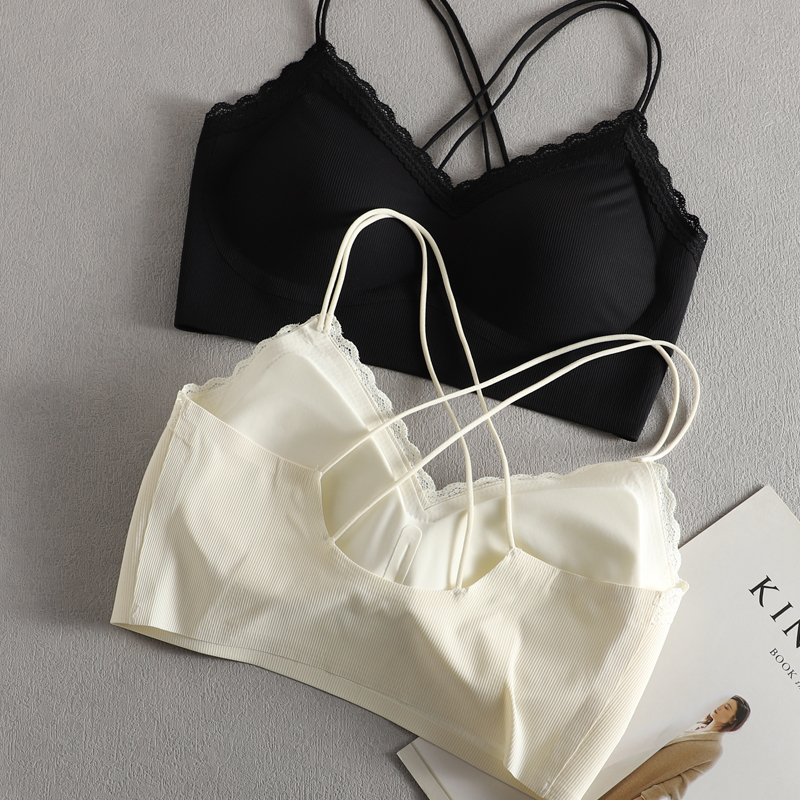 美背内衣女蕾丝无痕冰丝薄款 抹胸一体文胸夏 双肩带交叉运动背心式
