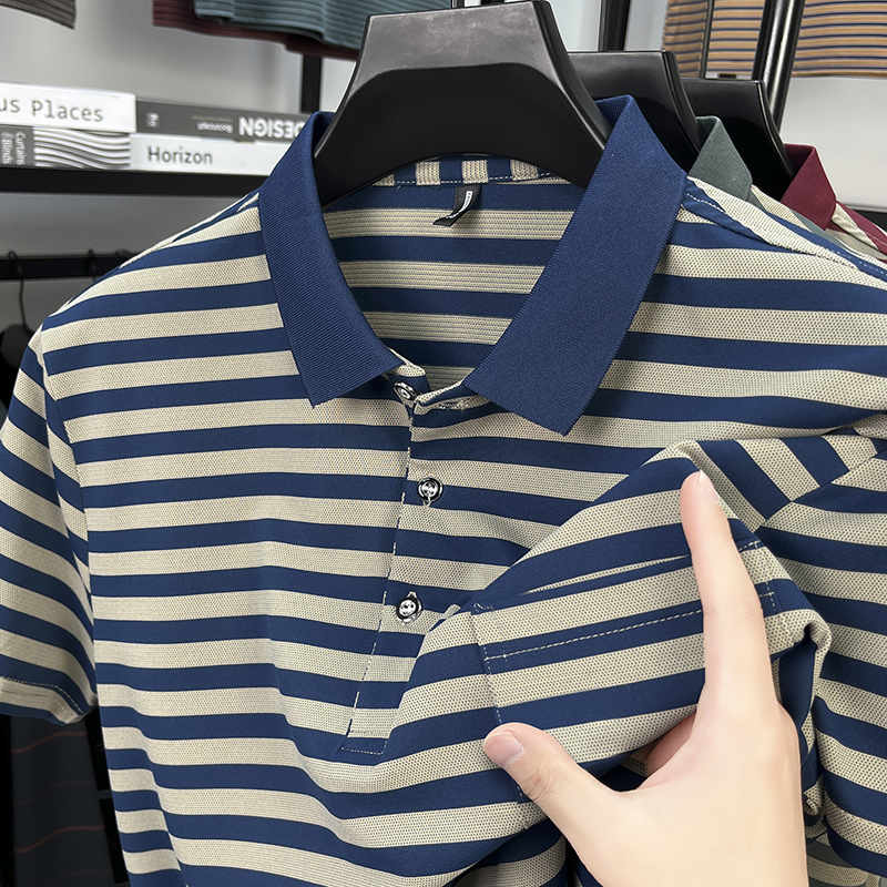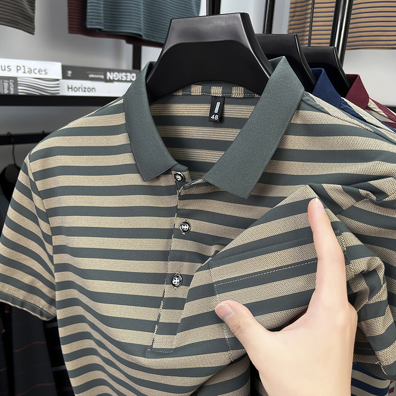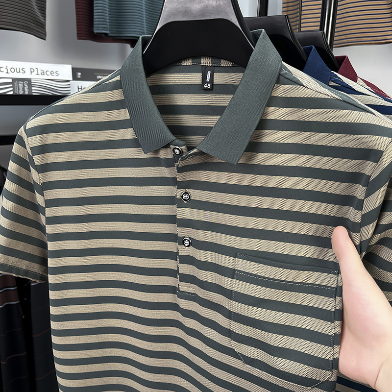 男士 凉感婚宴婚礼polo衫 红色条纹短袖 爸爸装 上衣服 T恤新款 真口袋