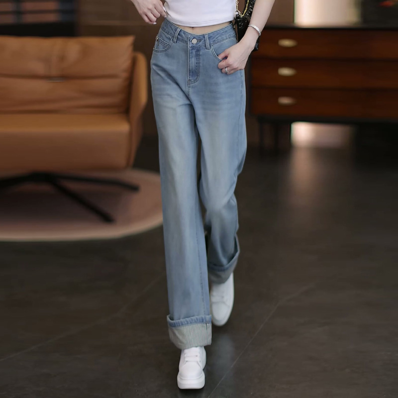 女夏薄款 子夏季 2025新款 阔腿裤 高腰显瘦慵懒风窄版 卷边直筒牛仔裤
