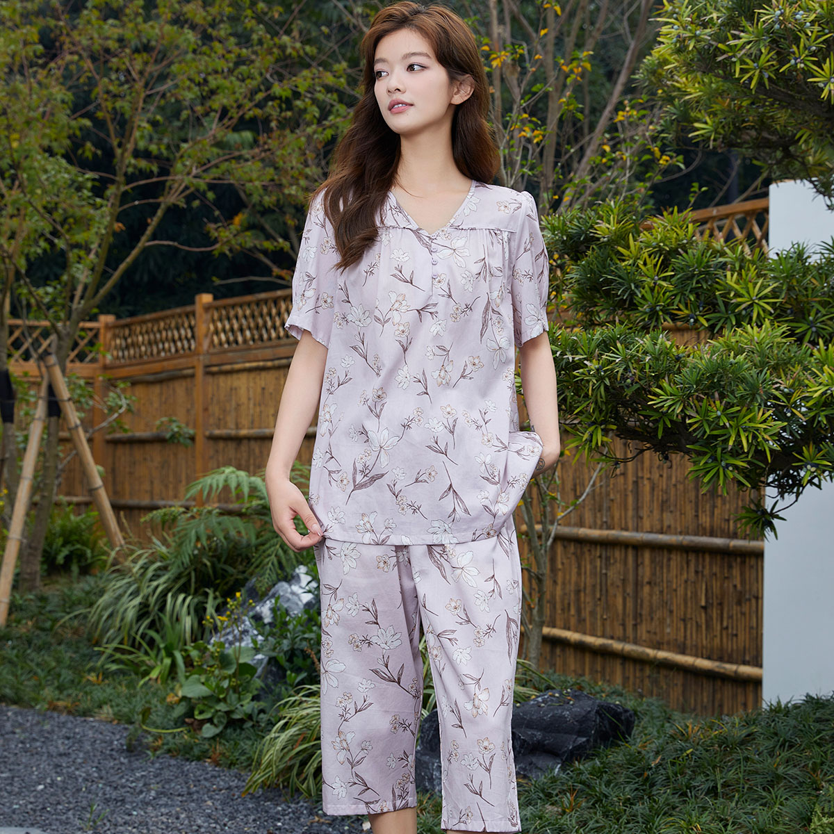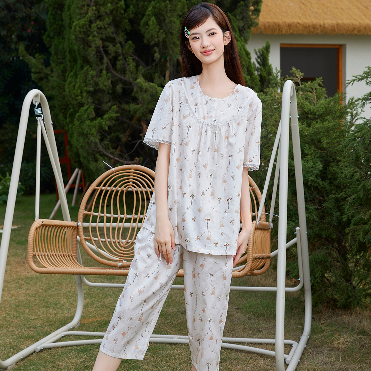 高级感家居服套装 猫人云朵棉带胸垫睡衣女款 开衫 九分袖 可外穿 夏季