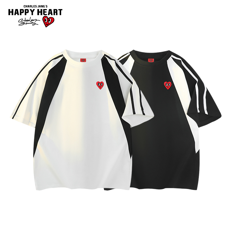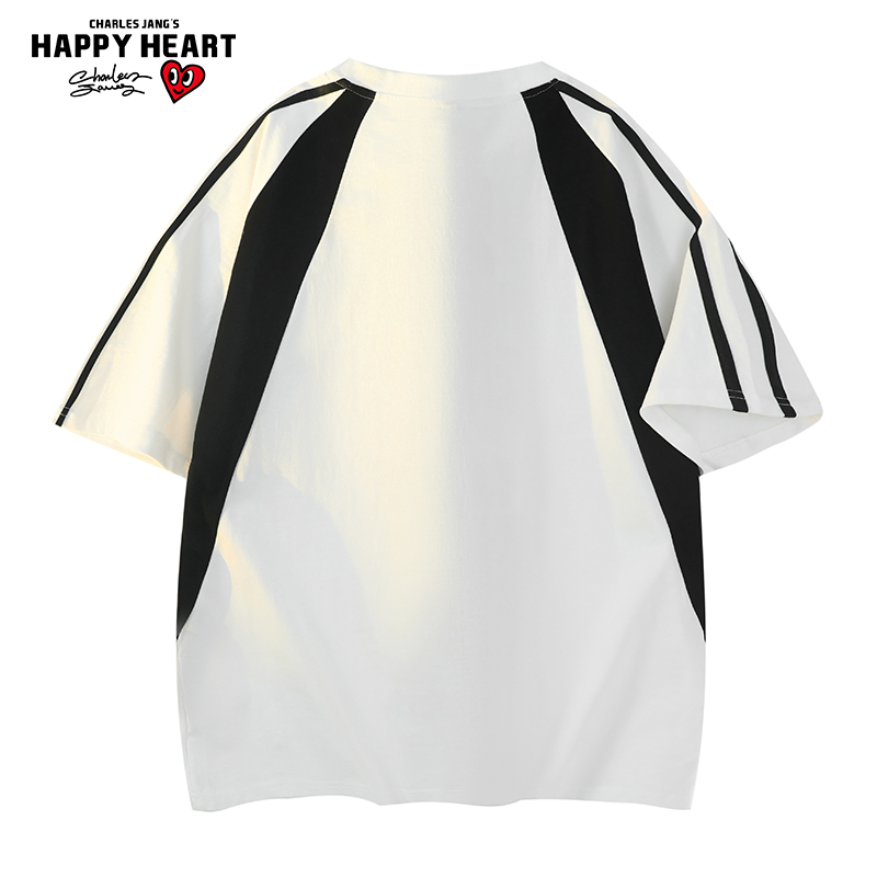 纯棉圆领半袖 查尔斯桃心 t恤男2025年夏季 条纹短袖 重磅拼接插肩袖