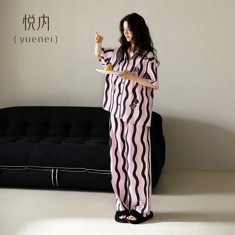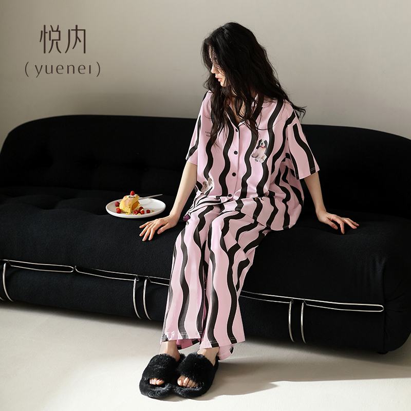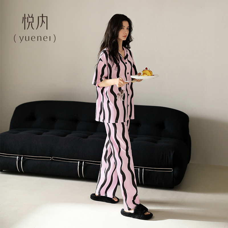 套装 悦内睡衣女夏季 家居服条纹宽松休闲卡通开衫 长裤 夏天纯棉短袖