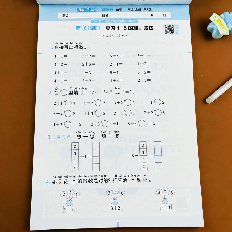 小学数学活页计算一年级上册人教版 20以内加减法混合20以内 教材同步口算竖式 进位加法分与合比大小 计算1年级上学期5 2025新版