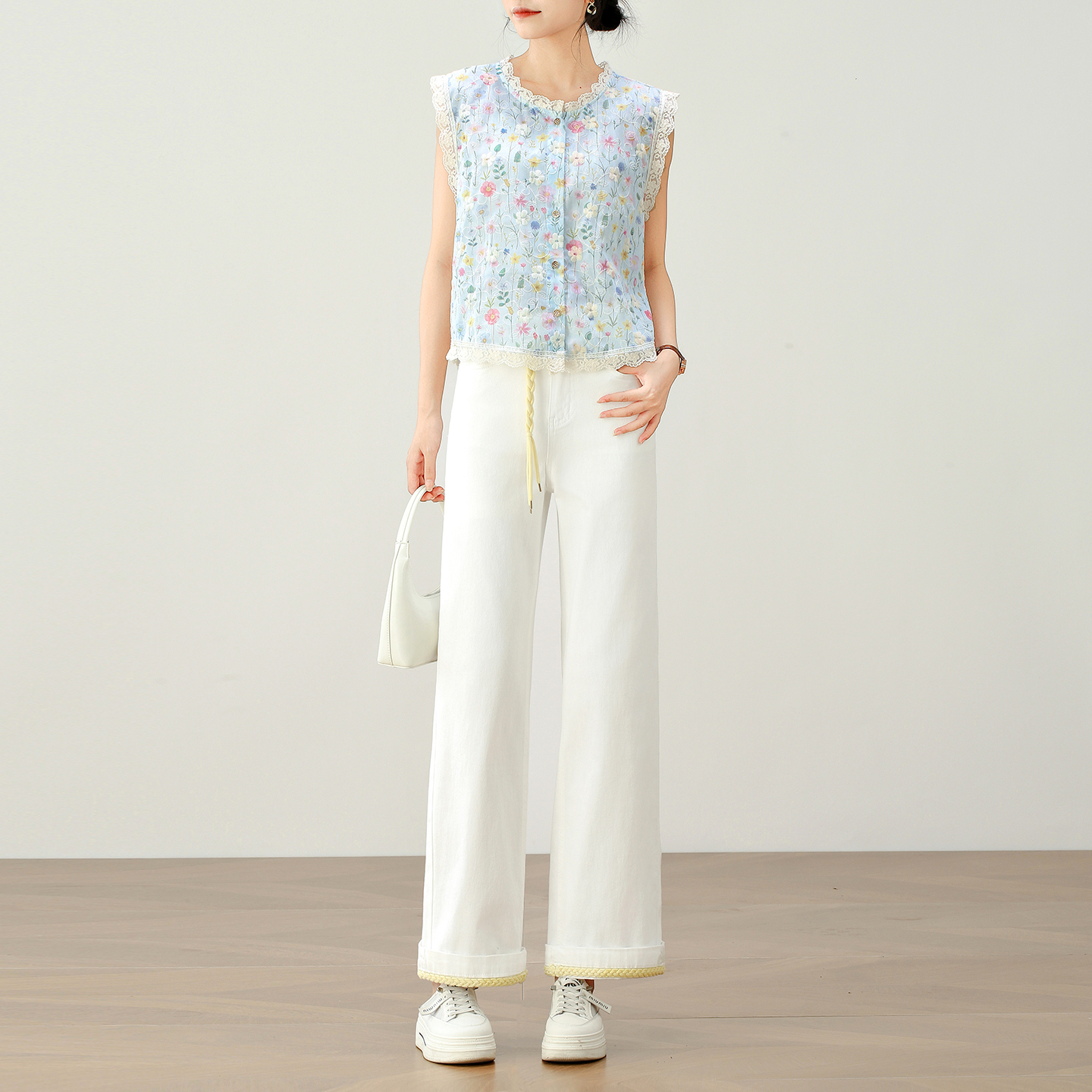 高腰显瘦阔腿裤 窄版 九分裤 女夏2025年新款 卷边刺绣垂感白色牛仔裤