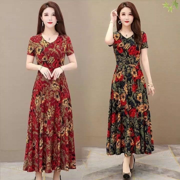 显瘦气质过膝长裙 印花大摆裙女妈妈装 春夏新款 冰丝连衣裙套头大码