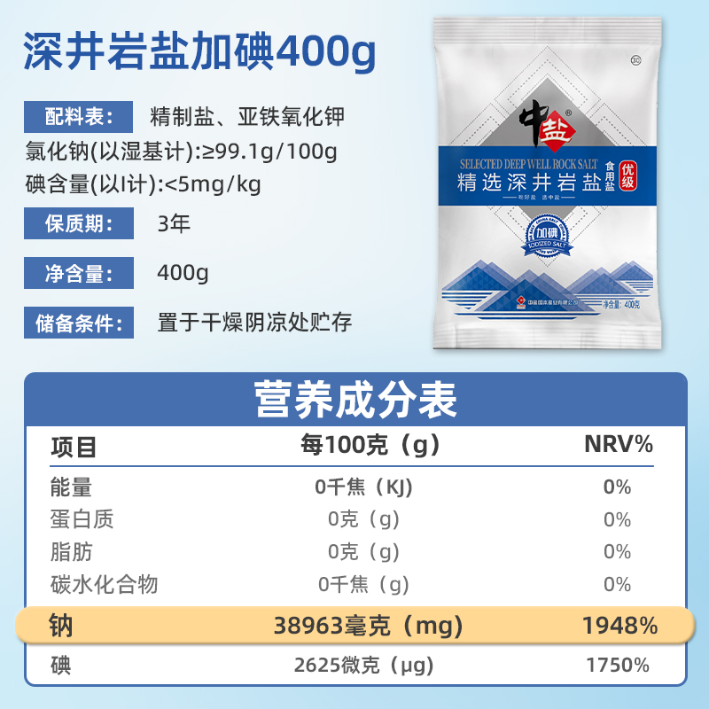 中盐优选加碘深井岩盐400g 5袋井矿盐食用盐家用炒菜精制细盐调料