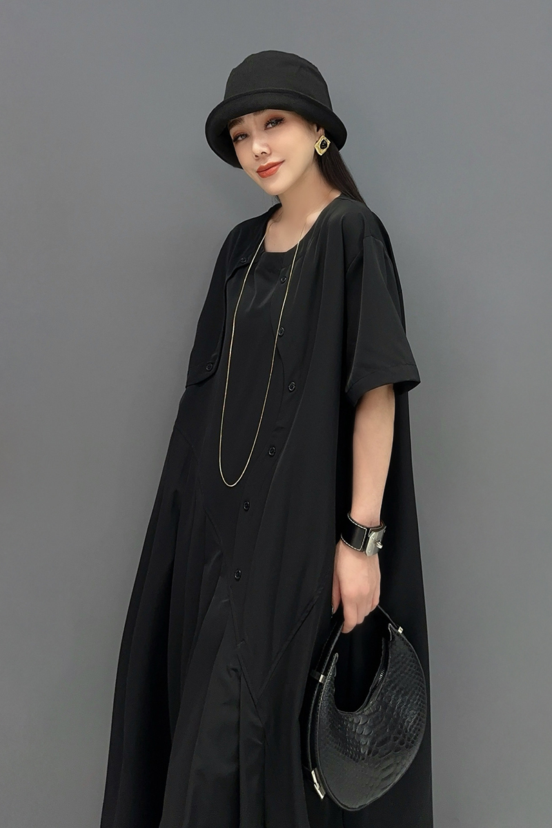 富家千金风收腰a字裙 2025新款 法式 赫本风假两件黑色连衣裙女秋装