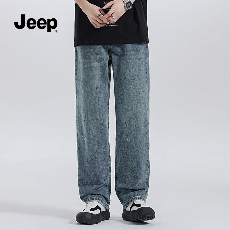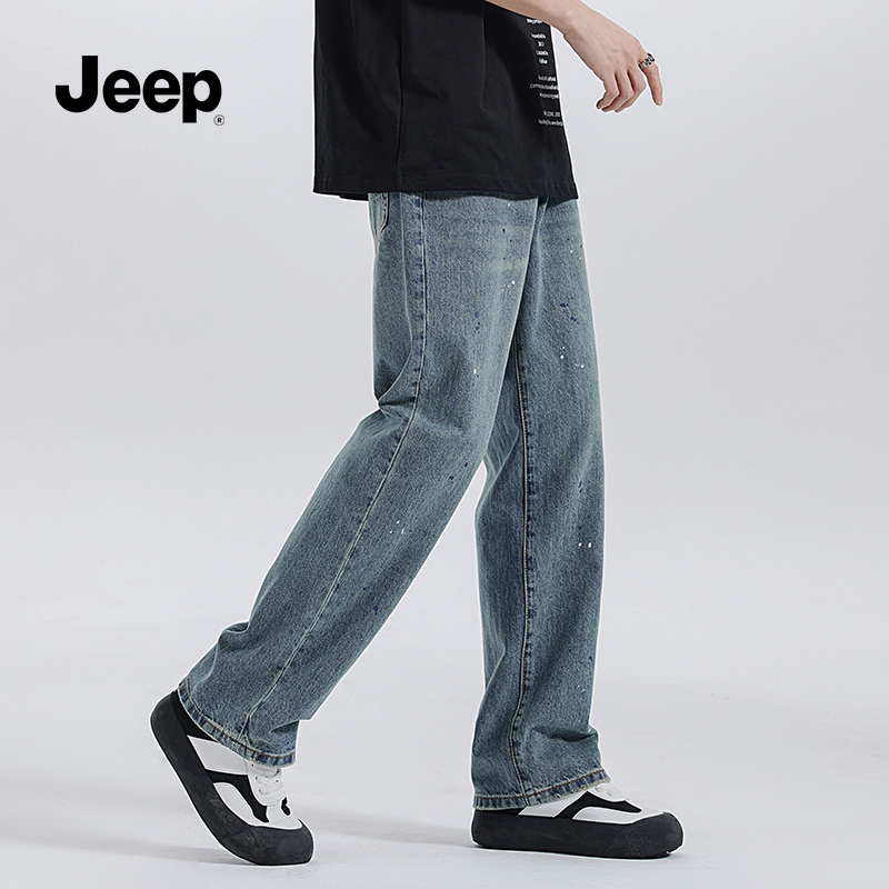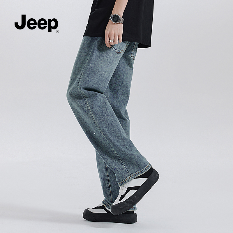 水洗做旧牛仔裤 复古褶皱直筒阔腿长裤 男春季 美式 新款 查尔斯桃心