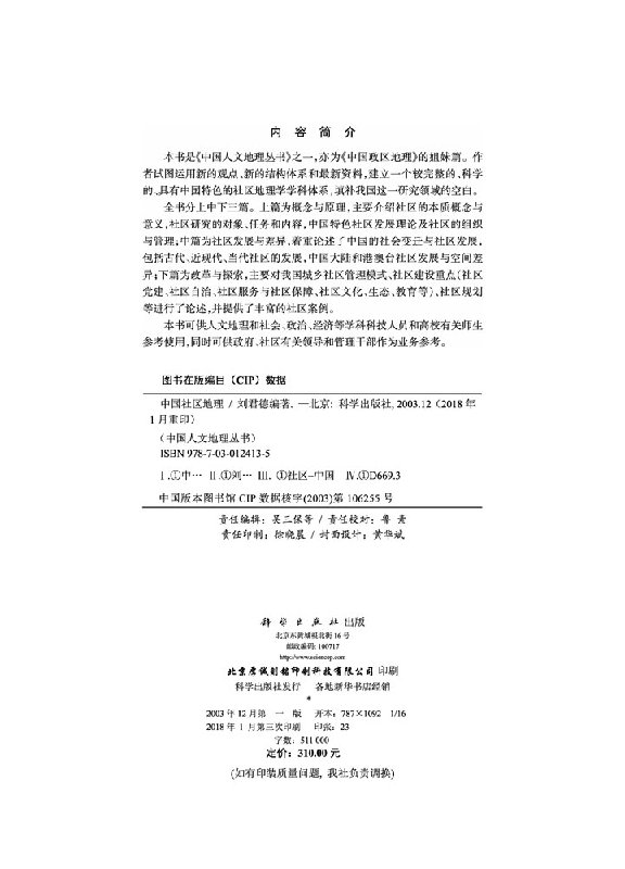 刘君德 吴传钧科学9787030124135书籍KX 中国社区地理 总主编 张俊芳 靳润成 中国人文地理丛书编者 精 典藏版 书