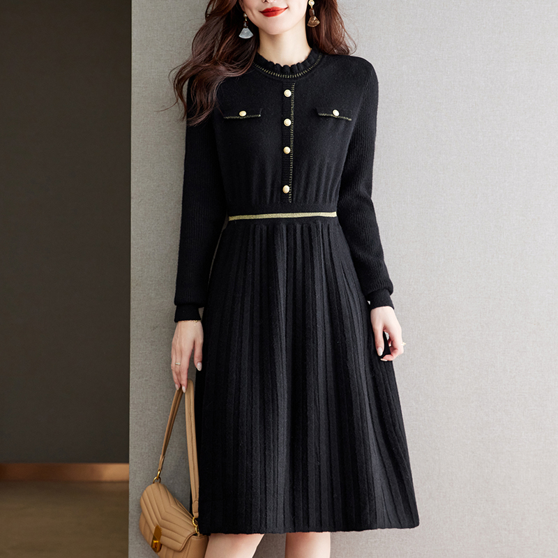 女装 大码 美丽客栈2025秋冬新款 高级感黑色针织连衣裙子 绵羊毛