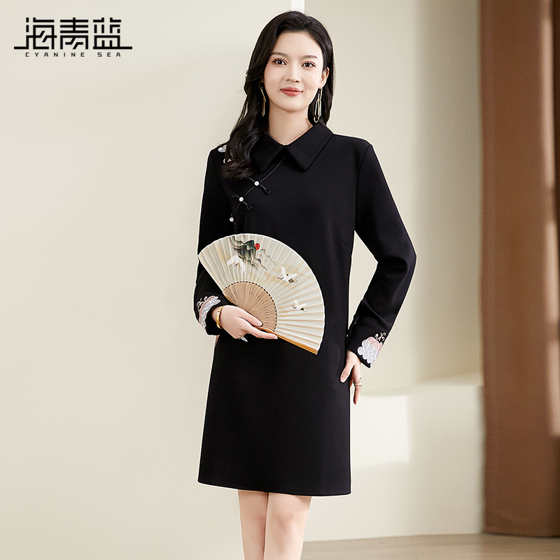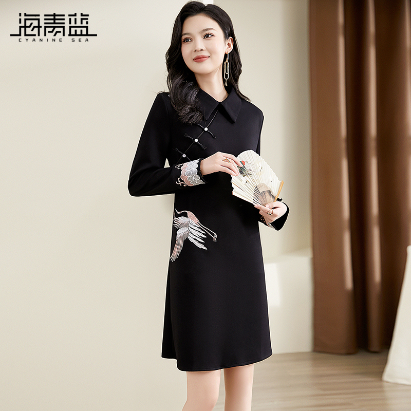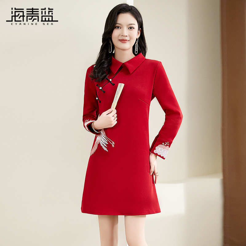 裙子 红色过年优雅中式 海青蓝复古国风盘扣刺绣连衣裙2025春装 新款