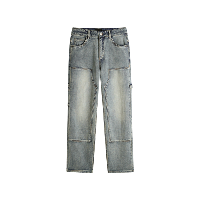 水洗做旧牛仔裤 复古褶皱直筒阔腿长裤 男春季 美式 新款 查尔斯桃心