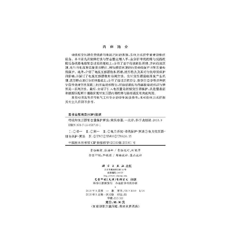 科学出版 束洪春 社 母线和变压器暂态量保护算法 全新正版