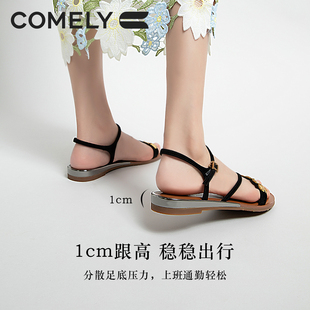 复古外穿休闲凉鞋 金属扣羊皮时尚 女2024夏新款 康莉平底一字带凉鞋