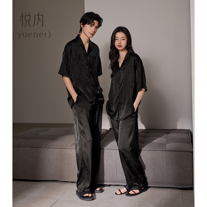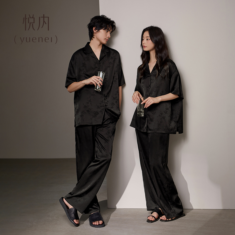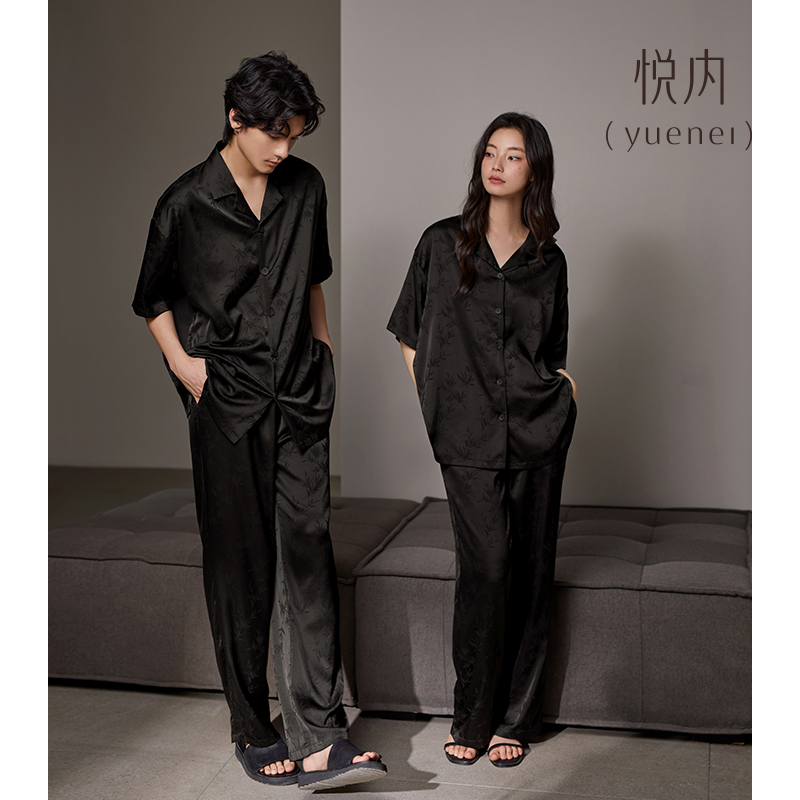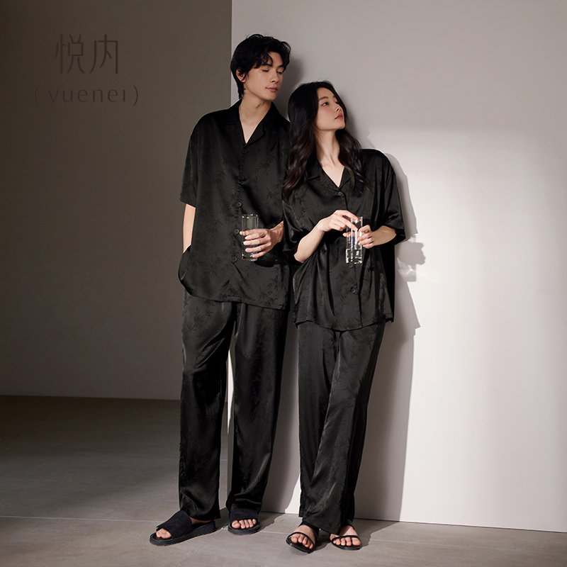 长裤 冰丝绸短袖 仿真丝家居服男黑色高级感 夏款 悦内情侣睡衣女夏季