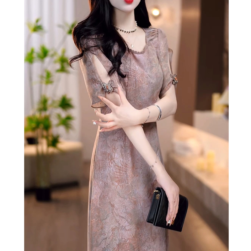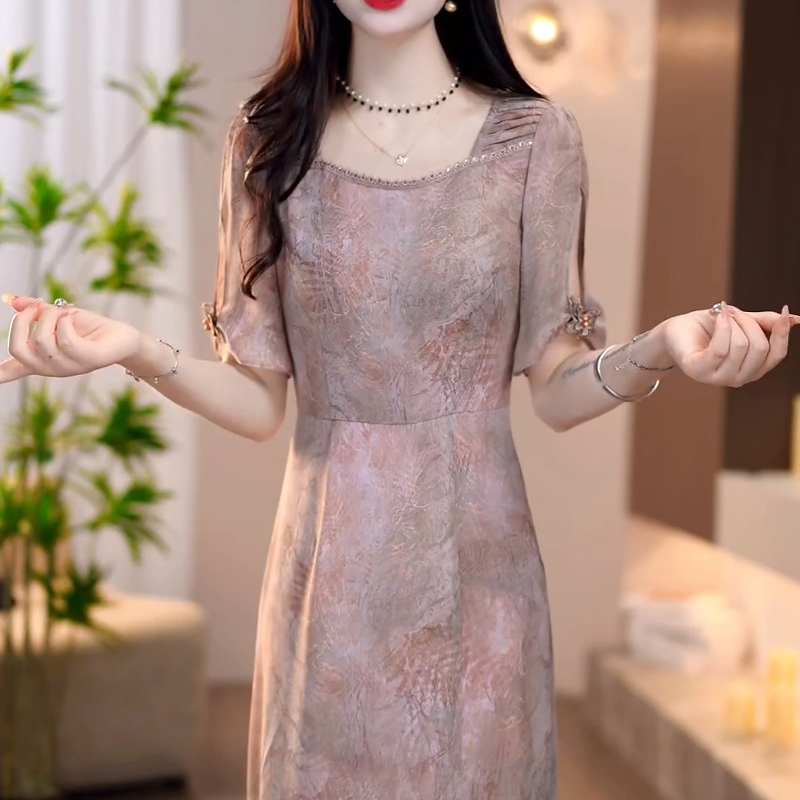 M2女装 中年妈妈弹力收腰显瘦H型系带提花连衣裙 2025春秋宽松大码