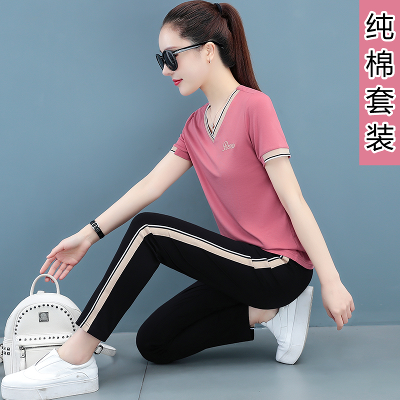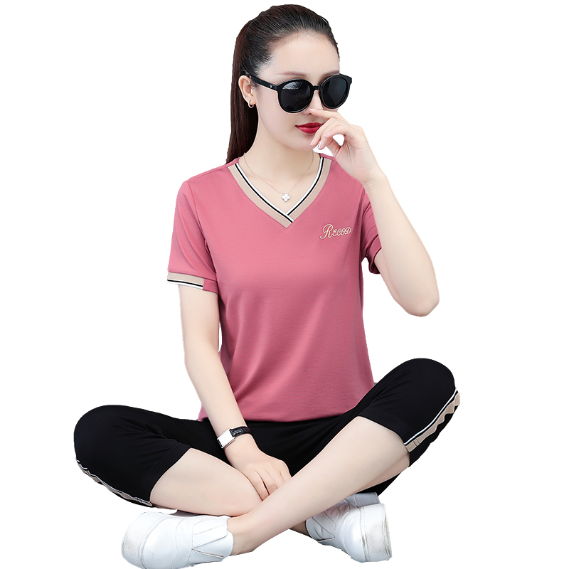 纯棉运动套装 时尚 女休闲服两件套V领2023年夏季 新款 妈妈 夏装 短袖