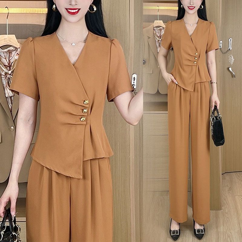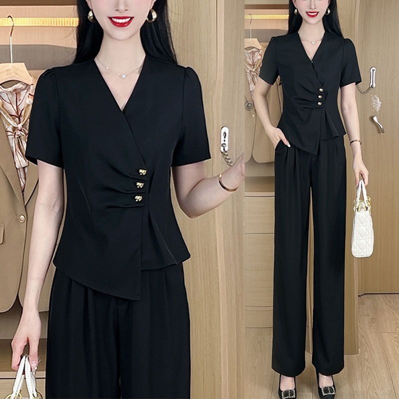 新款 气质显瘦设计感套装 v领短袖 两件套女时尚 上衣直筒裤 2025夏季