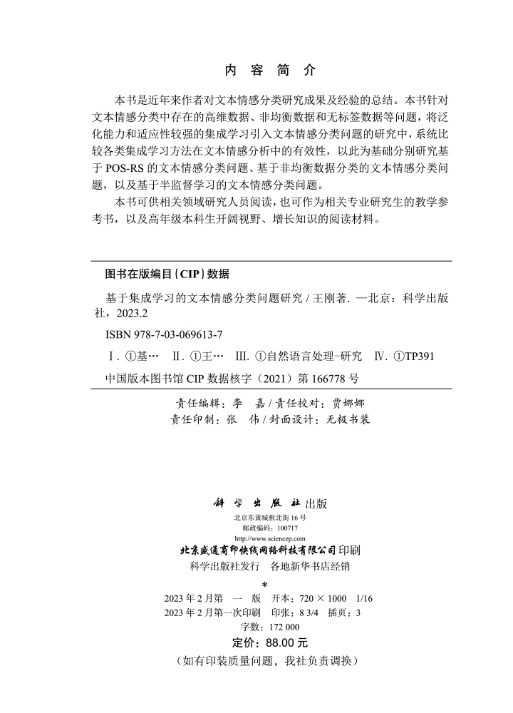 王刚 文本情感分类问题研究 科学 龙门书局出版 9787030696137 现货正版 社 基于集成学习