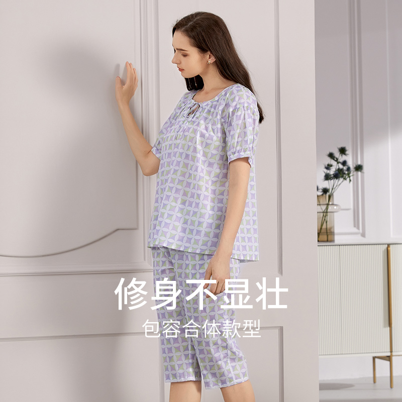 女款 秋鹿梭织家居服女夏薄款 纯棉睡衣夏款 七分裤 甜美印花V领短袖