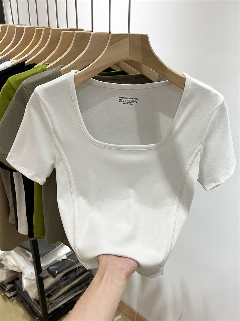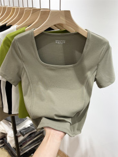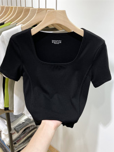 修身 欧货高腰短款 新款 t恤女2022夏装 洋气半圆下摆上衣潮 方领短袖