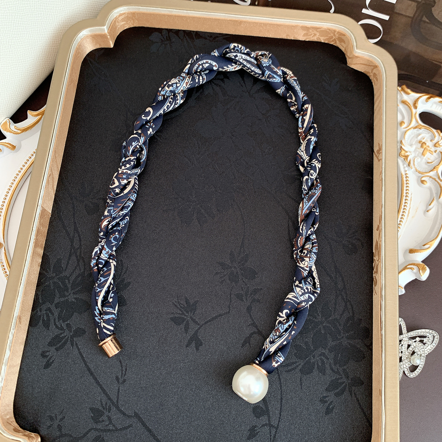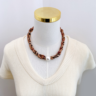 咖啡格子珍珠磁铁扣项链小丝巾女锁骨链围巾装 饰领巾护颈围脖春夏